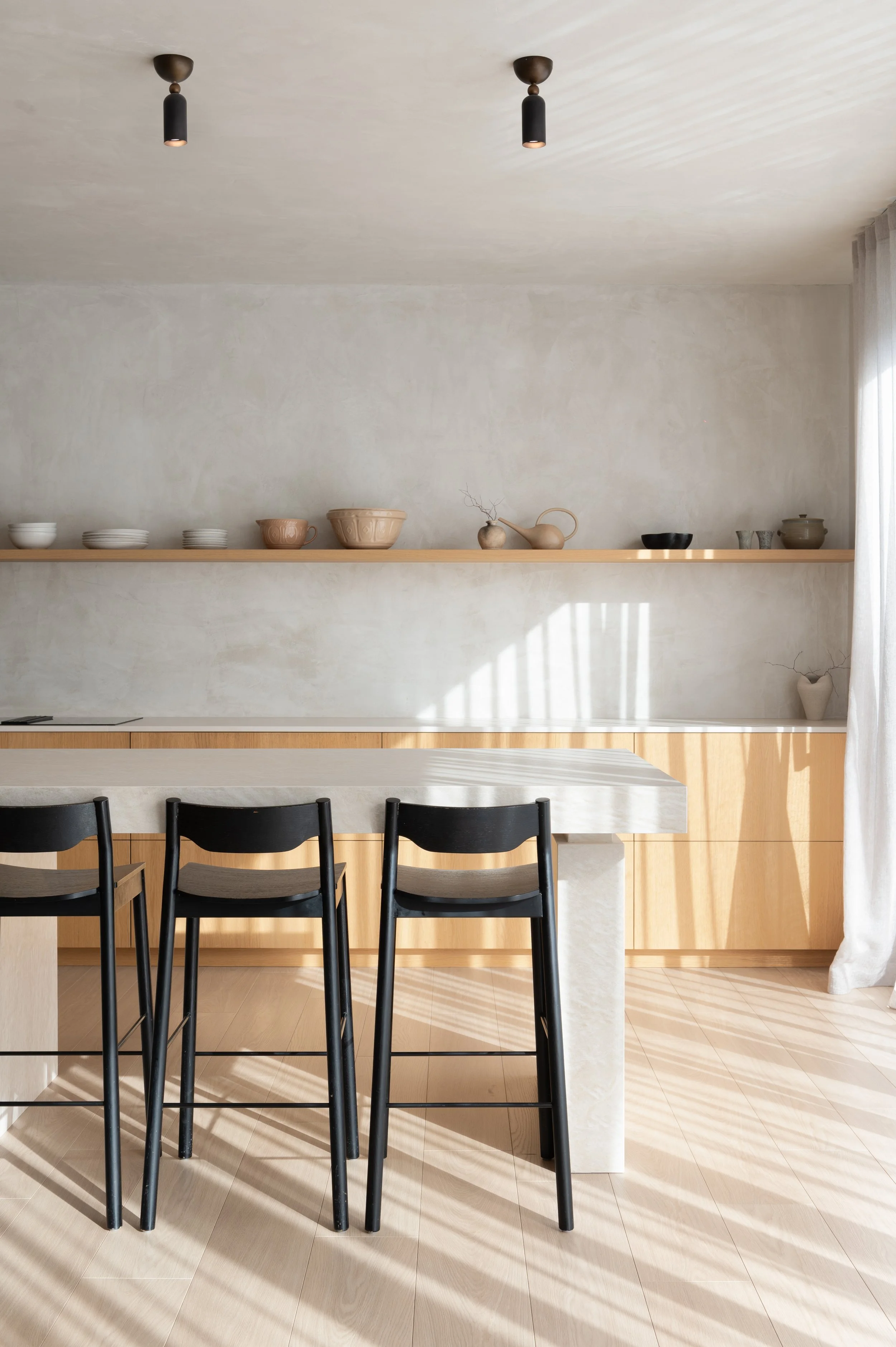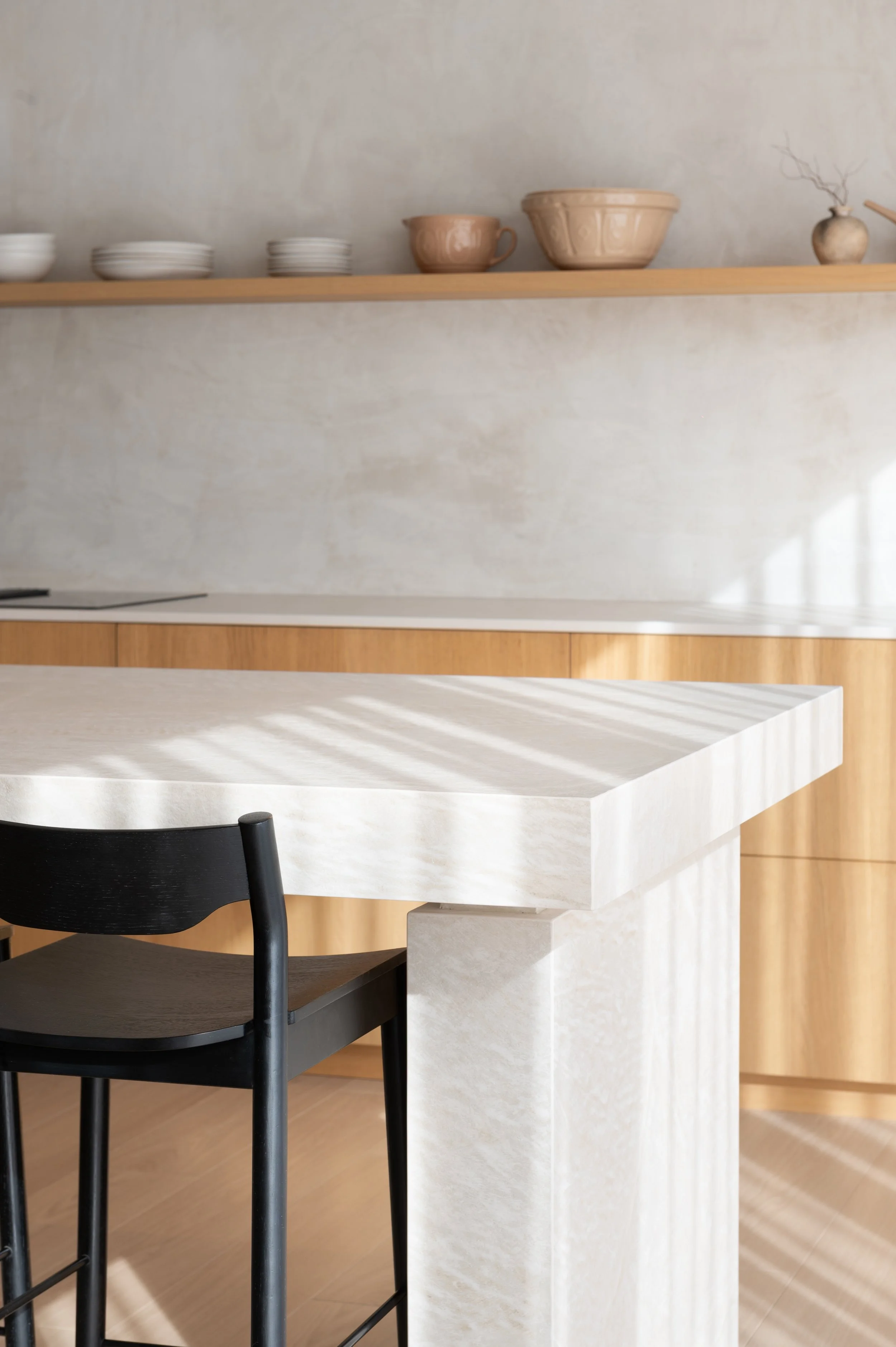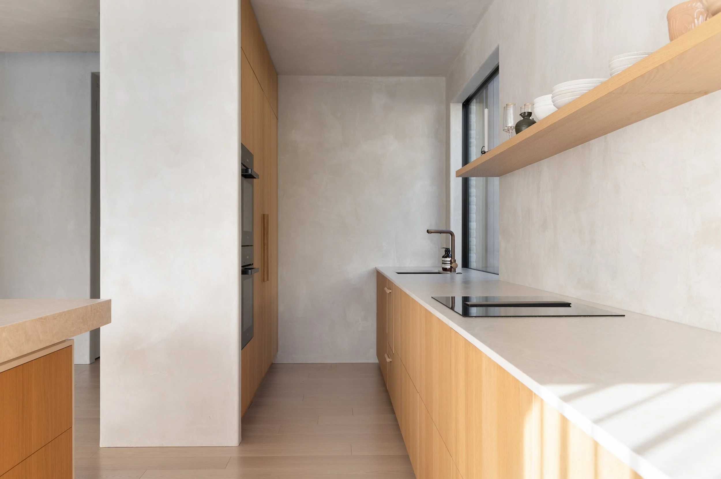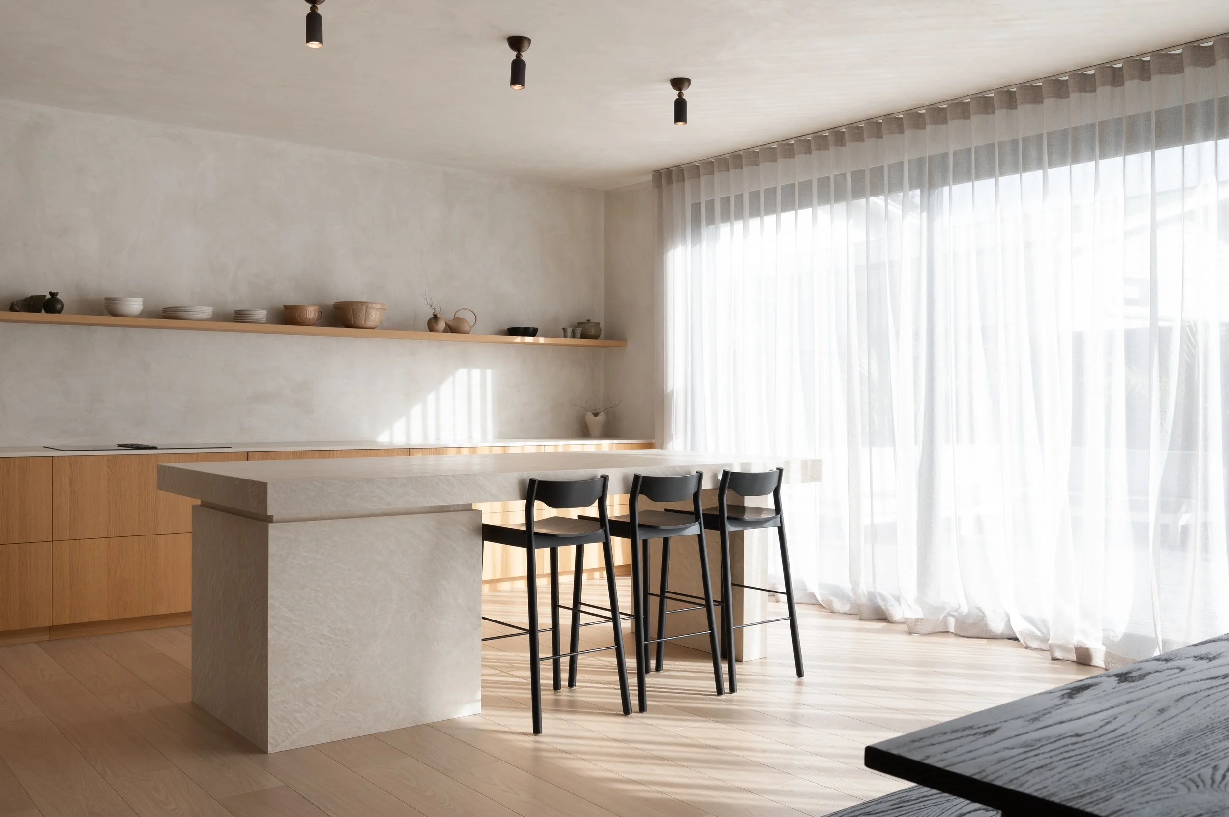 The Bennett residence kitchen evokes a sense of calm and simplicity with its sculpture-like island bench setting the tone for the minimalist design by RMI Interiors. Long clean lines and neutral tones creates a spacious and refined quality with plenty of practical storage. The paring of Vidaspace Ivory Oak Veneer cabinetry and Dekton Liquid Shell porcelain adds warmth and texture to the stunning space.