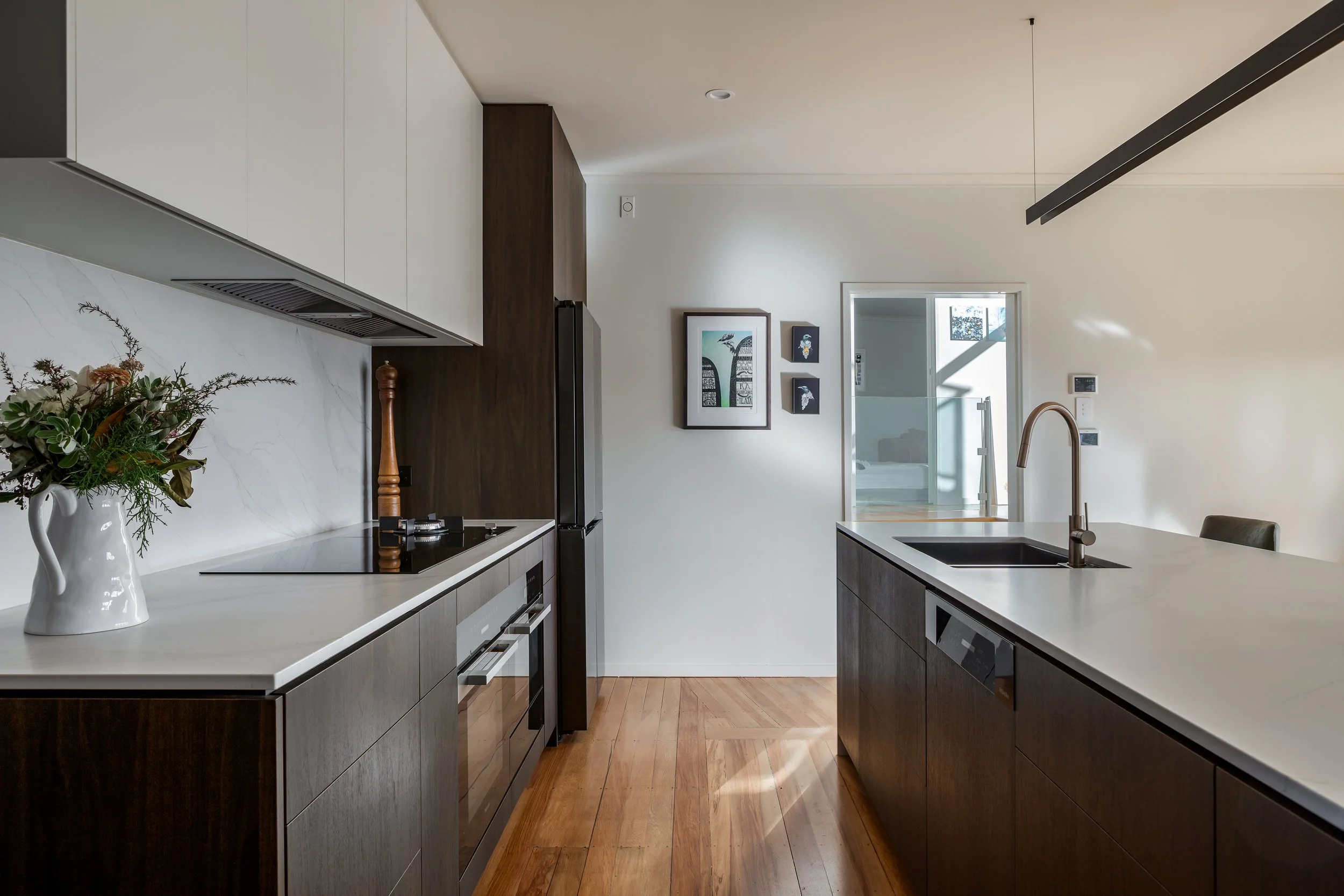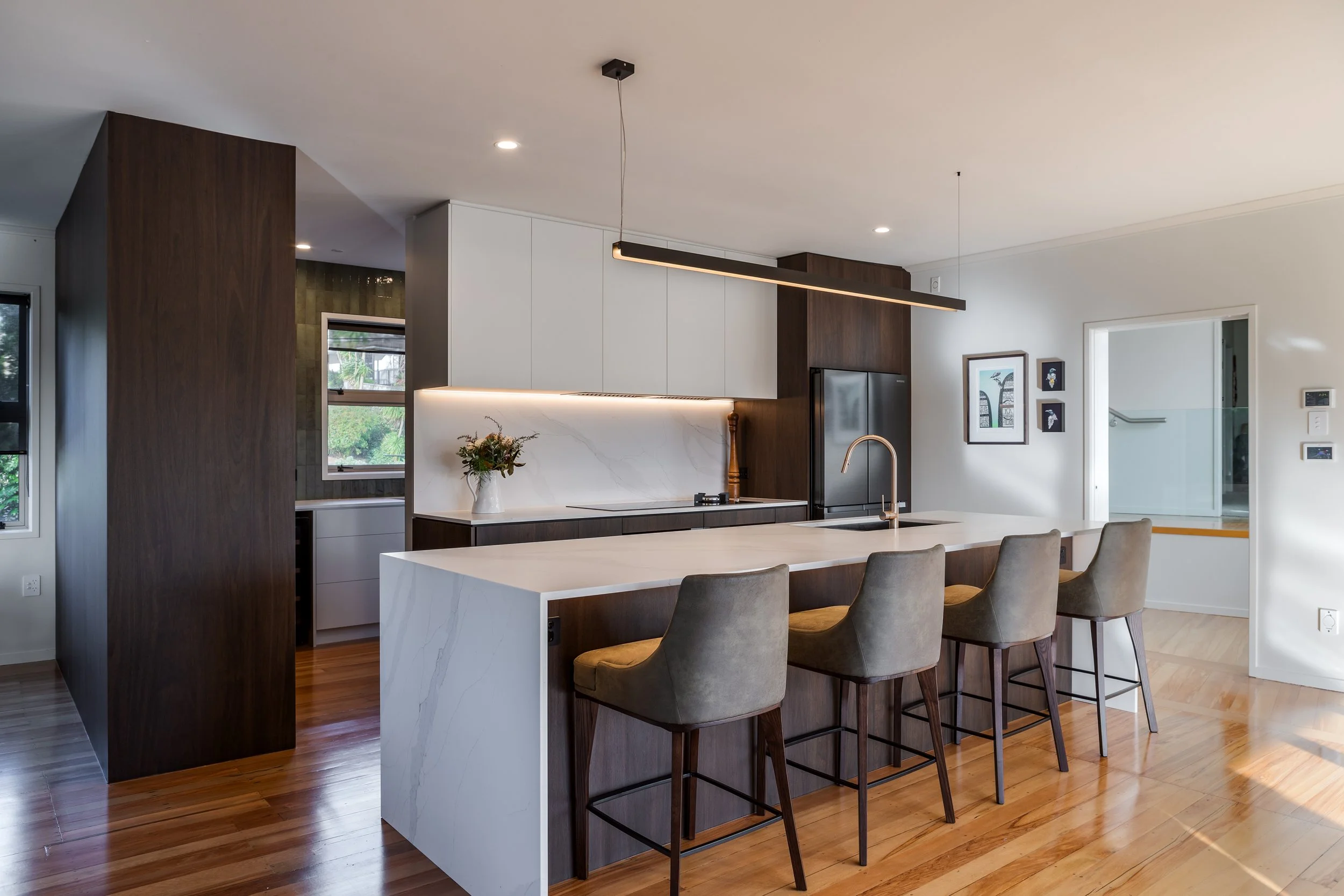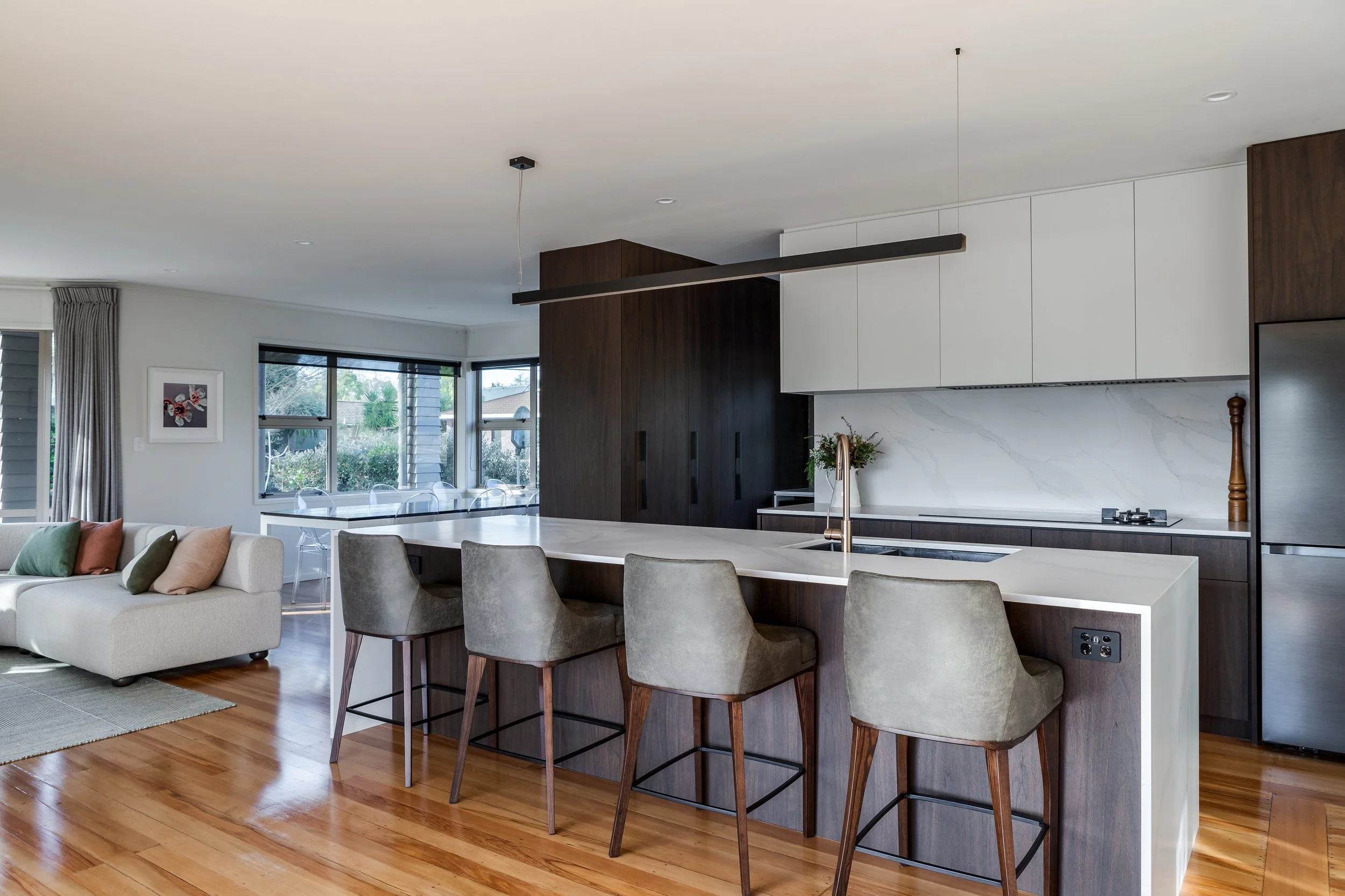 The striking elements of timber floors, chocolate veneers, and marbled white tops combine to create a modern, yet timeless kitchen we are proud to showcase. The Lennon residence sits overlooking the Waikato River in one of Hamilton’s central leafy suburbs. The transformational renovation incorporates a new layout of the kitchen/dining space, adding an island, a scullery, and a wall of pantry storage separating the dining room.