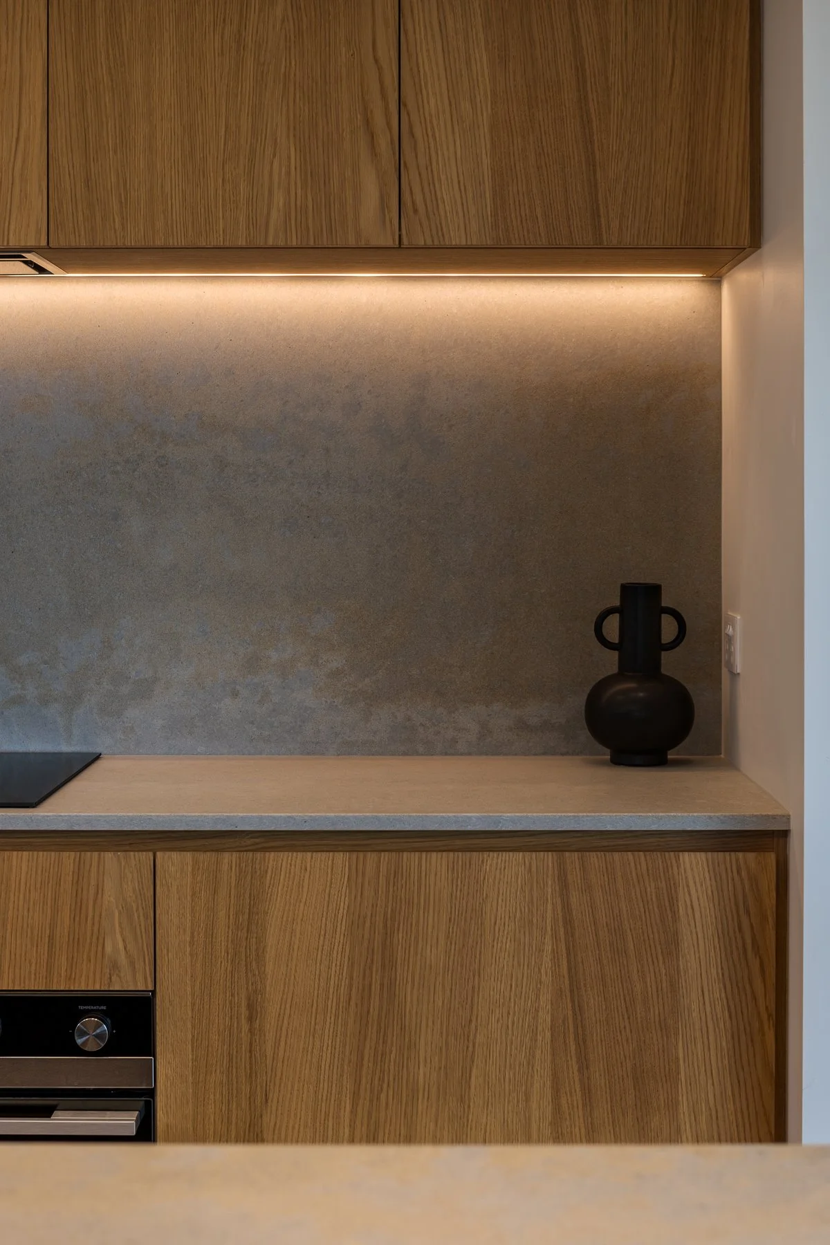 Out in Ngahinapouri sits this stunning minimal new build home. This kitchen features Vidaspace Shinnoki Natural Oak with a contrasting island in Stardust Walnut. Caesarstone Primordia was chosen for the benchtops and splashback, tying in with the warmth of the timber. To keep a minimal look, sharknose handles, hidden drawers and negative details have been included.