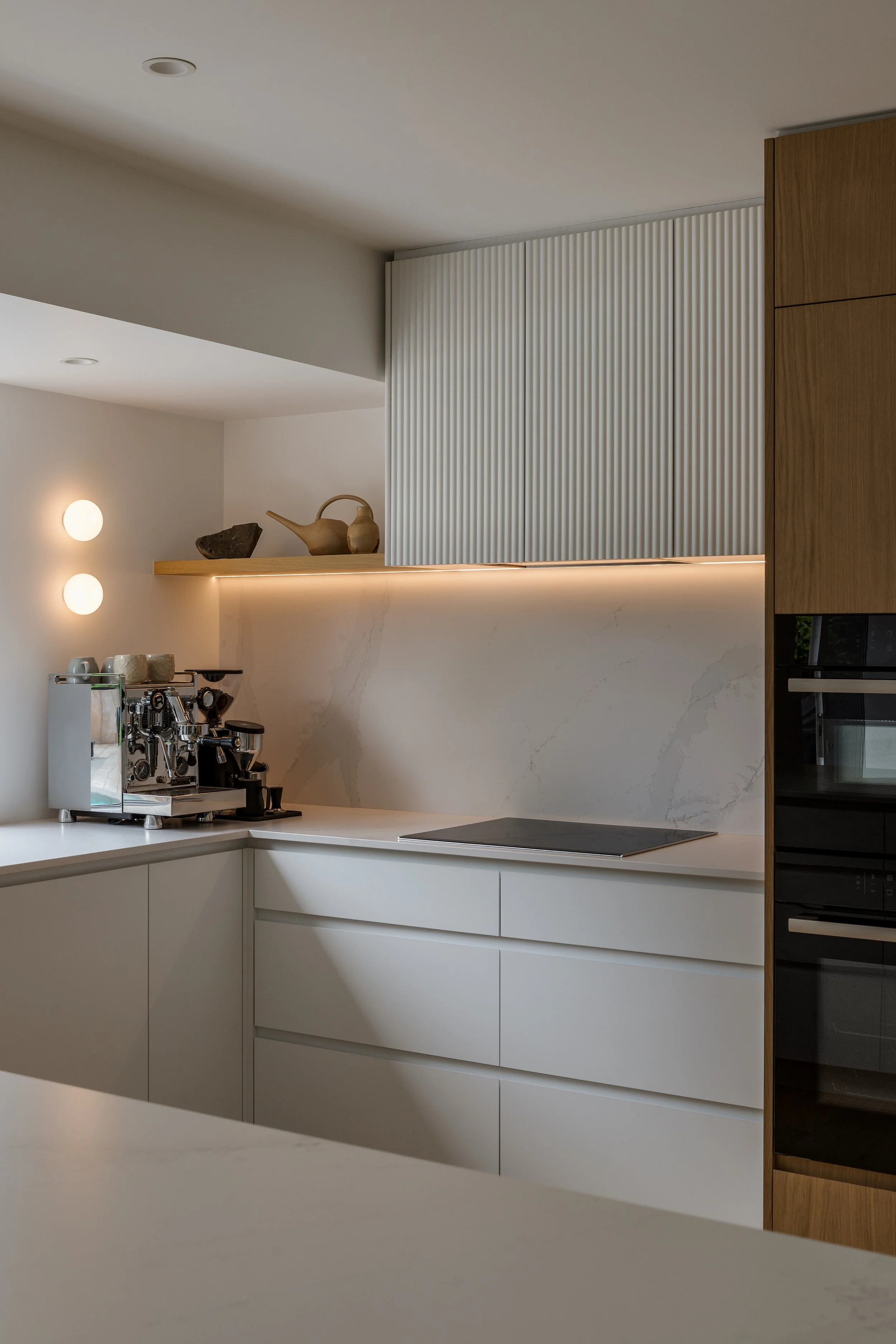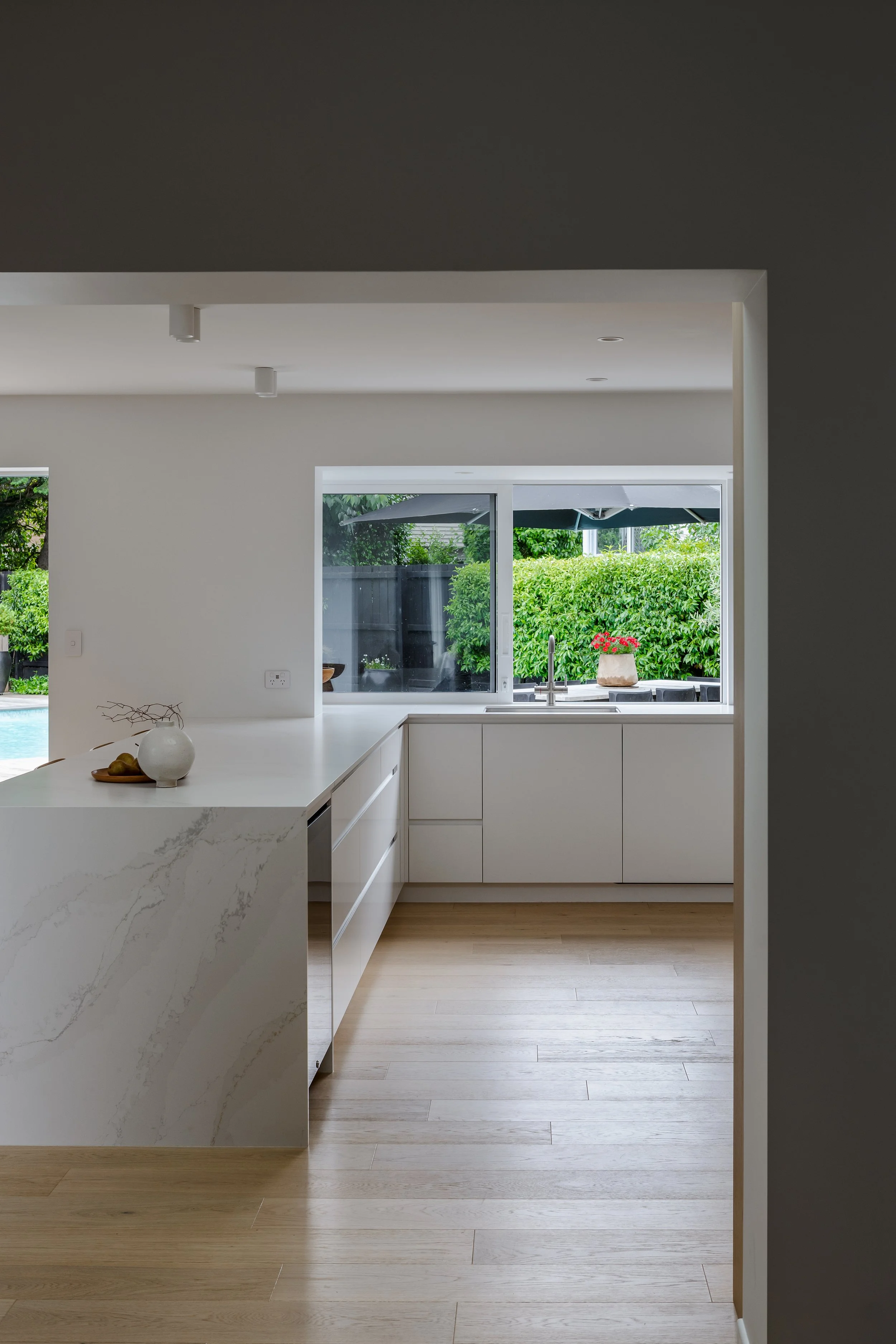 The joinery design, characterized by its peeled-back aesthetic, embodies simplicity at its finest. The hidden pantry door seamlessly integrates into the overall composition, adding an element of intrigue to the kitchen.