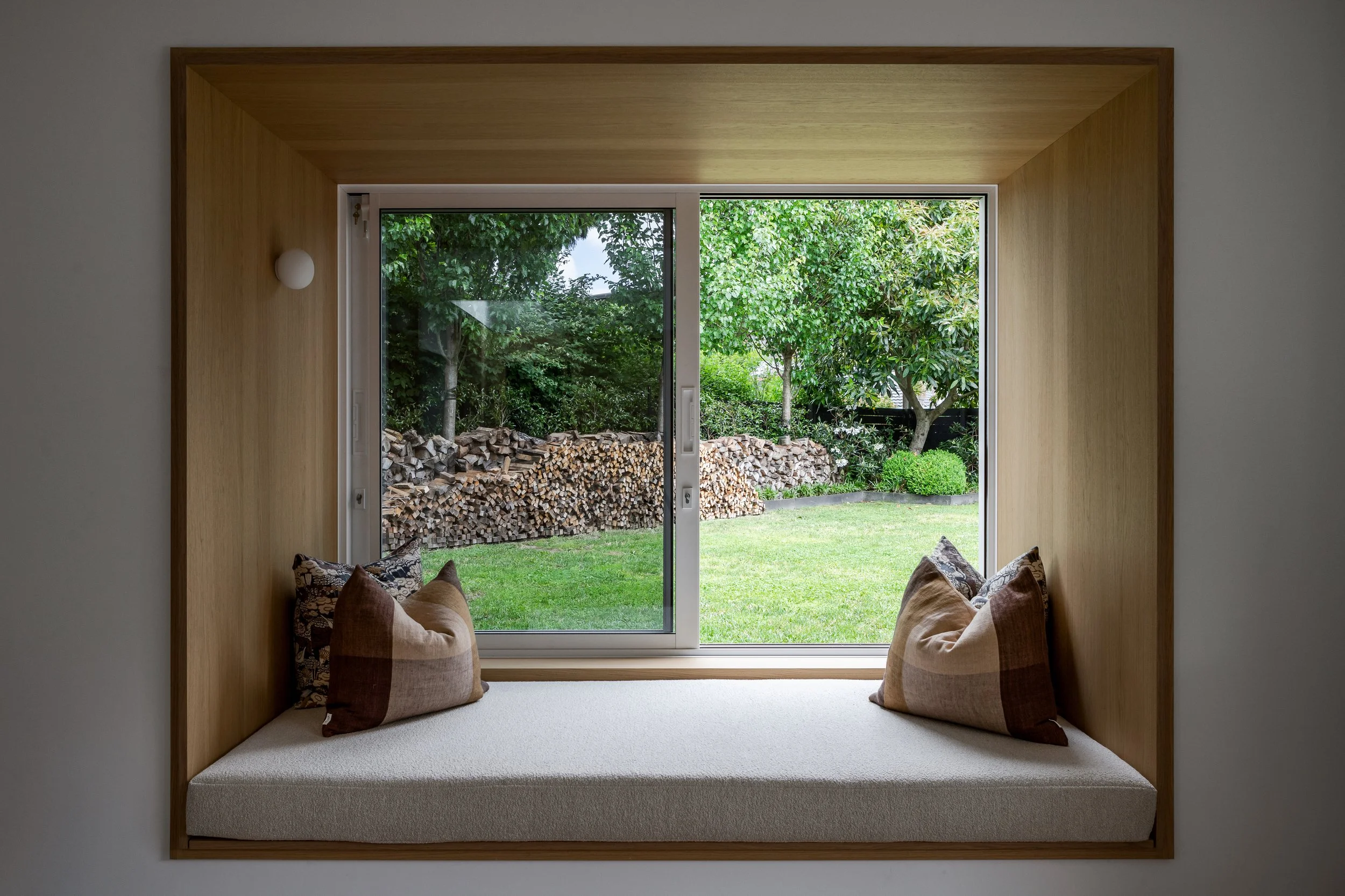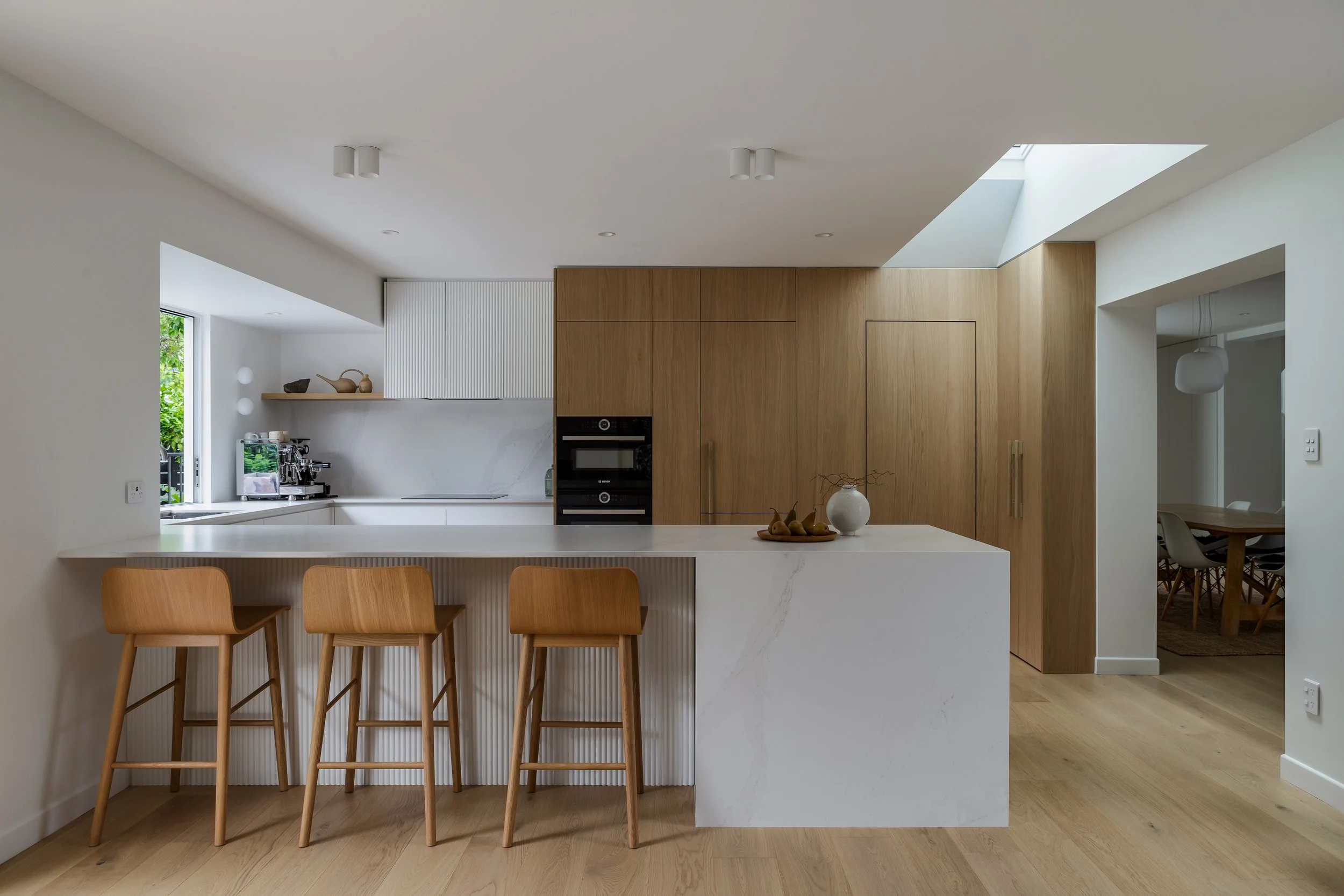 Custom oak handles punctuate the VidaSpace Ivory Oak veneer in the kitchen and the oak flows through to the snug seat in the dining room. The Sagedoors Mississippi profile panels finished in 2-pac lacquer offers texture and compliment the Silestone Calacatta Gold Suede stone top.