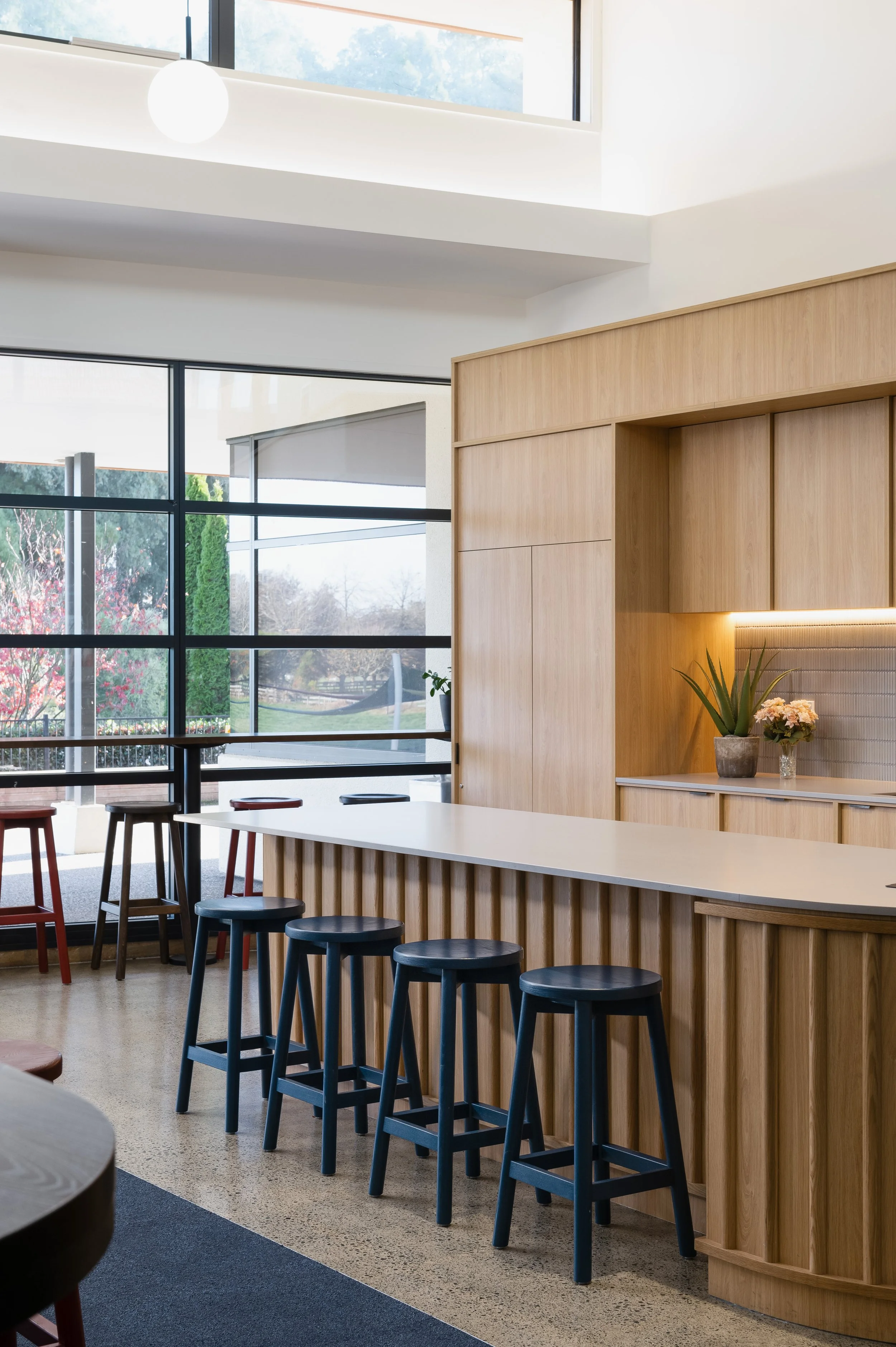 The thoughtful design of St Peter’s College Kitchen and Lounge by Designwell showcases a seamless integration of traditional and modern aesthetics. The use of curves, rounded timber battens, and a soft neutral palette works together to create a sophisticated and warm space, ideal for both casual and formal gatherings.